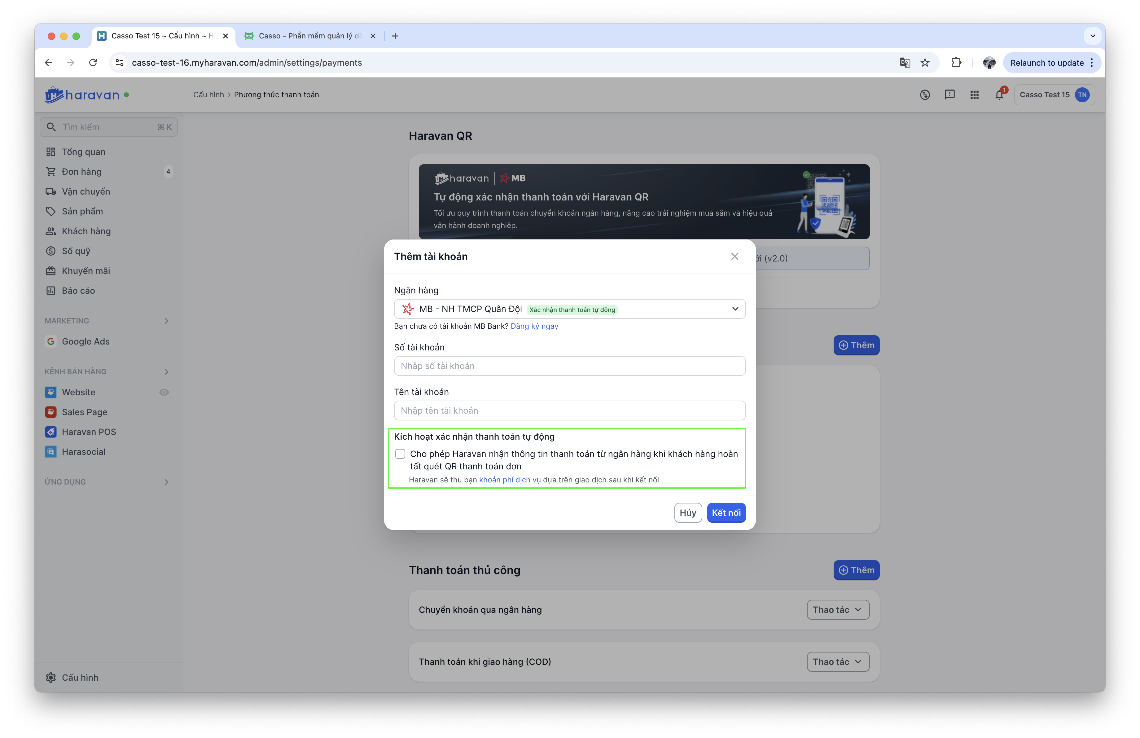 ## Cấu hình tích hợp Casso Flow vào Haravan <a href="#cau-hinh-tich-hop-casso-vao-haravan" id="cau-hinh-tich-hop-casso-vao-haravan"></a>