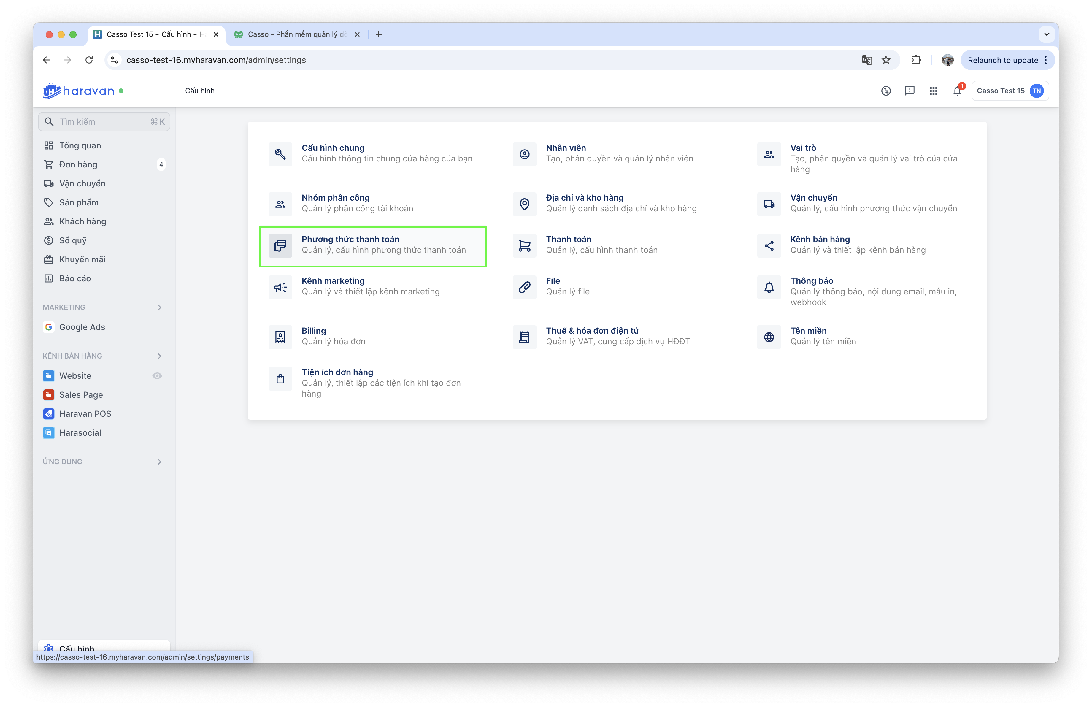 Vào trang **Admin của Haravan** => **Cấu hình** => **Phương thức thanh toán.**
