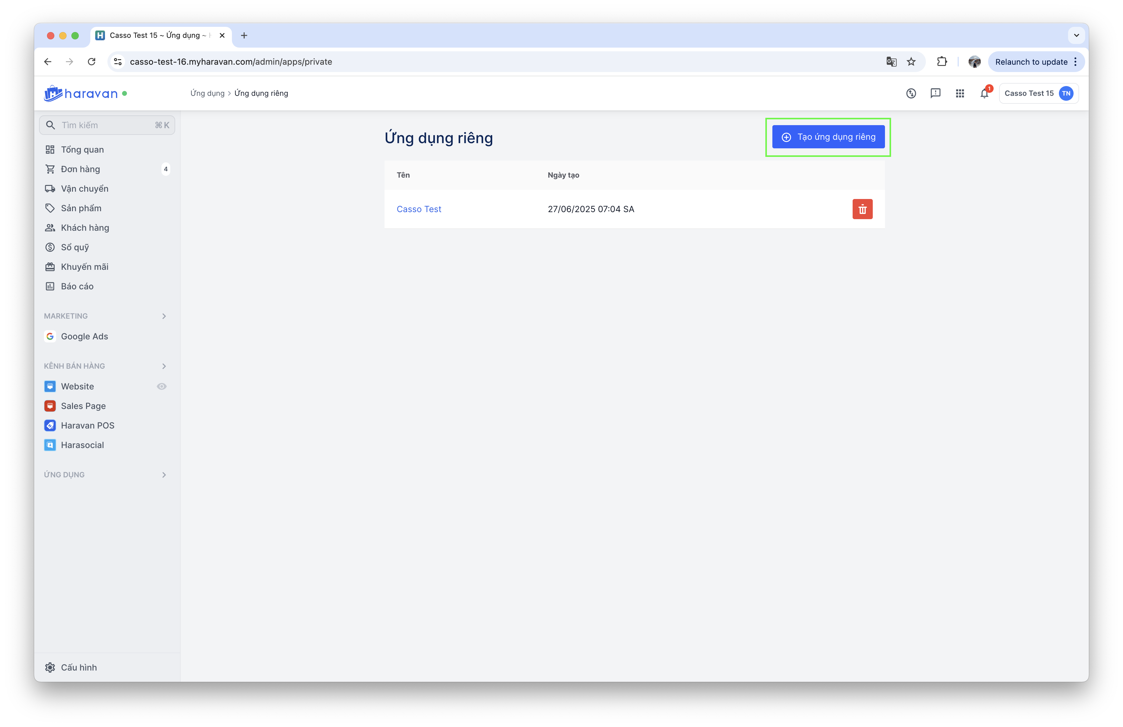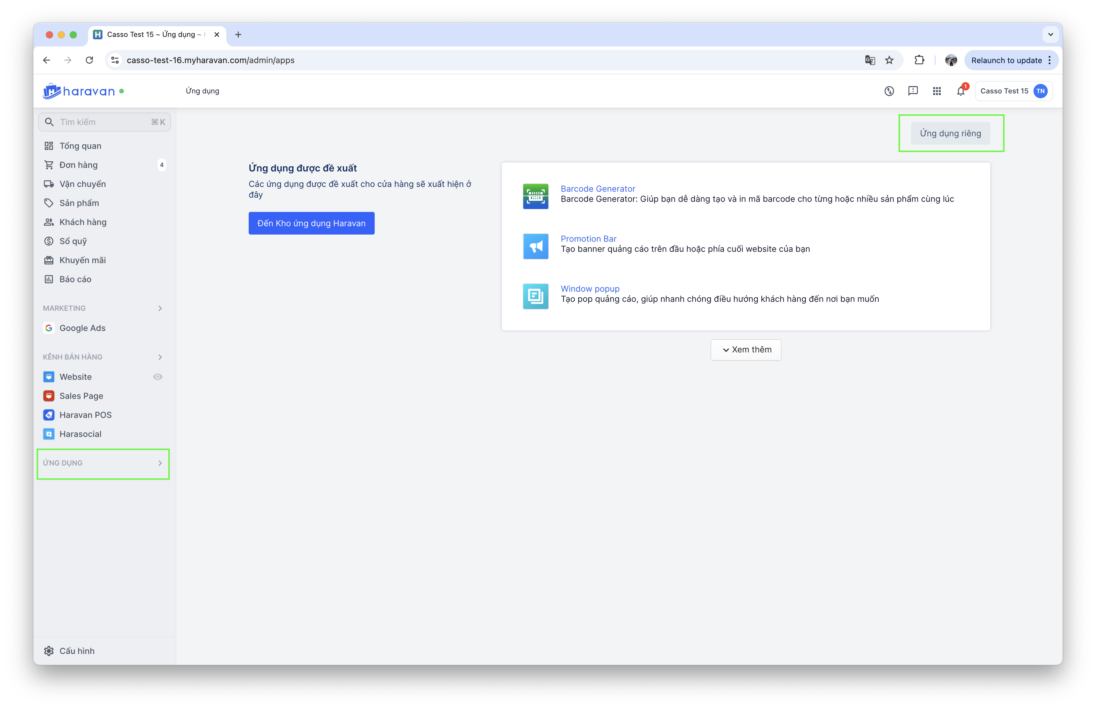 Truy cập vào **trang** **admin** trên website Haravan của bạn => **Ứng dụng** => **Ứng dụng riêng**