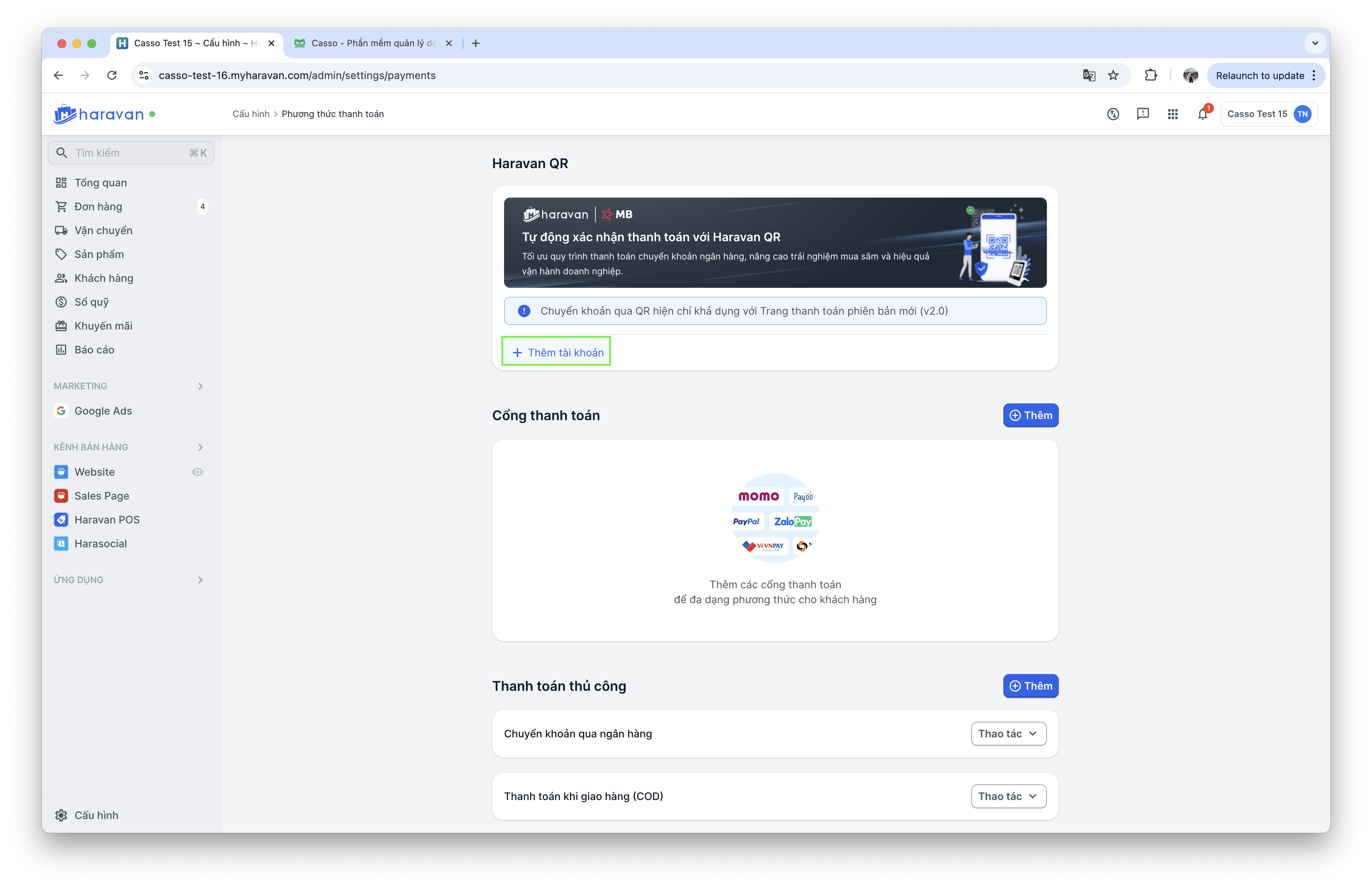 Ở phương thức thanh toán Haravan QR, nhấn nút **Thêm tài khoản**