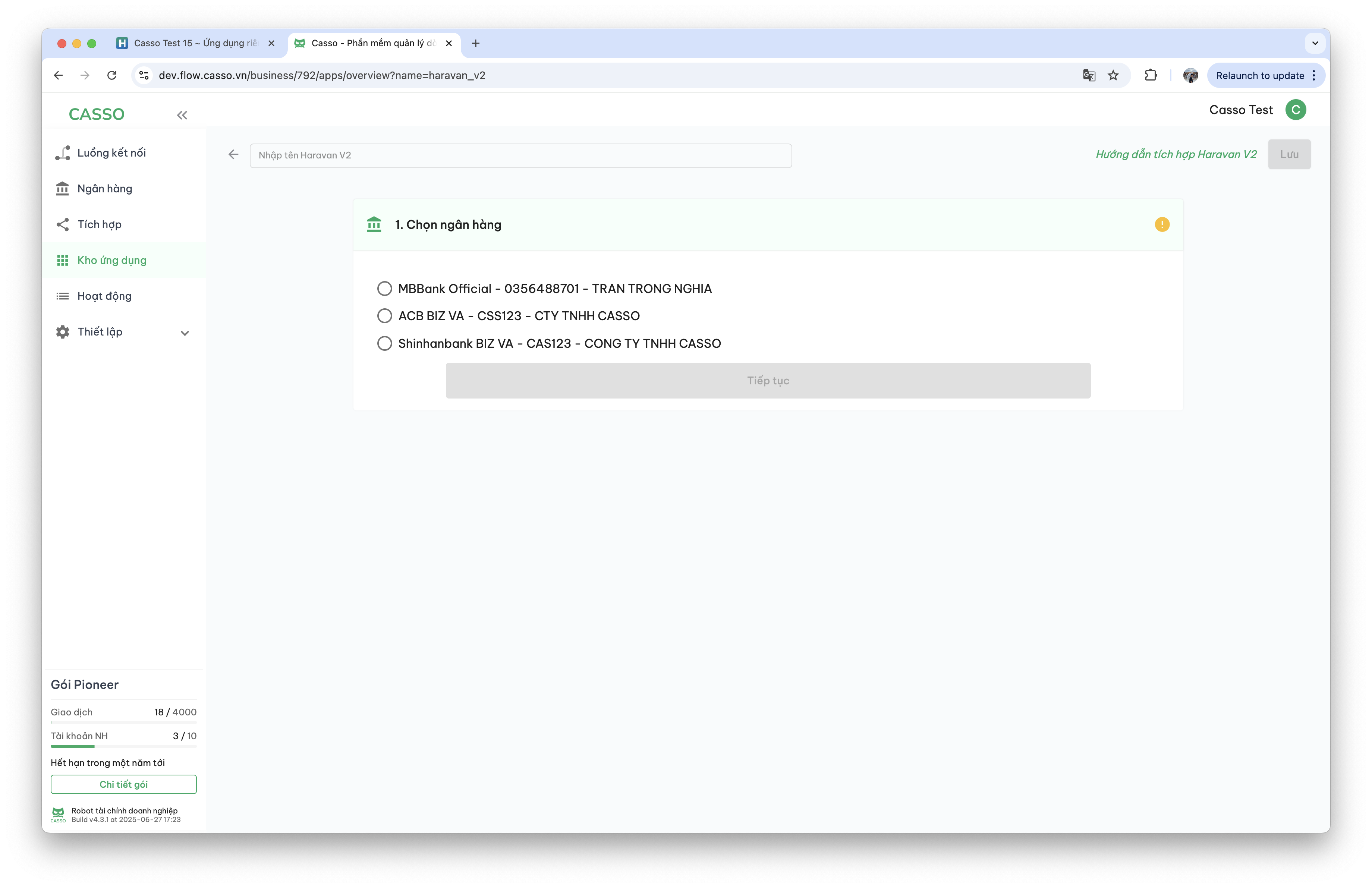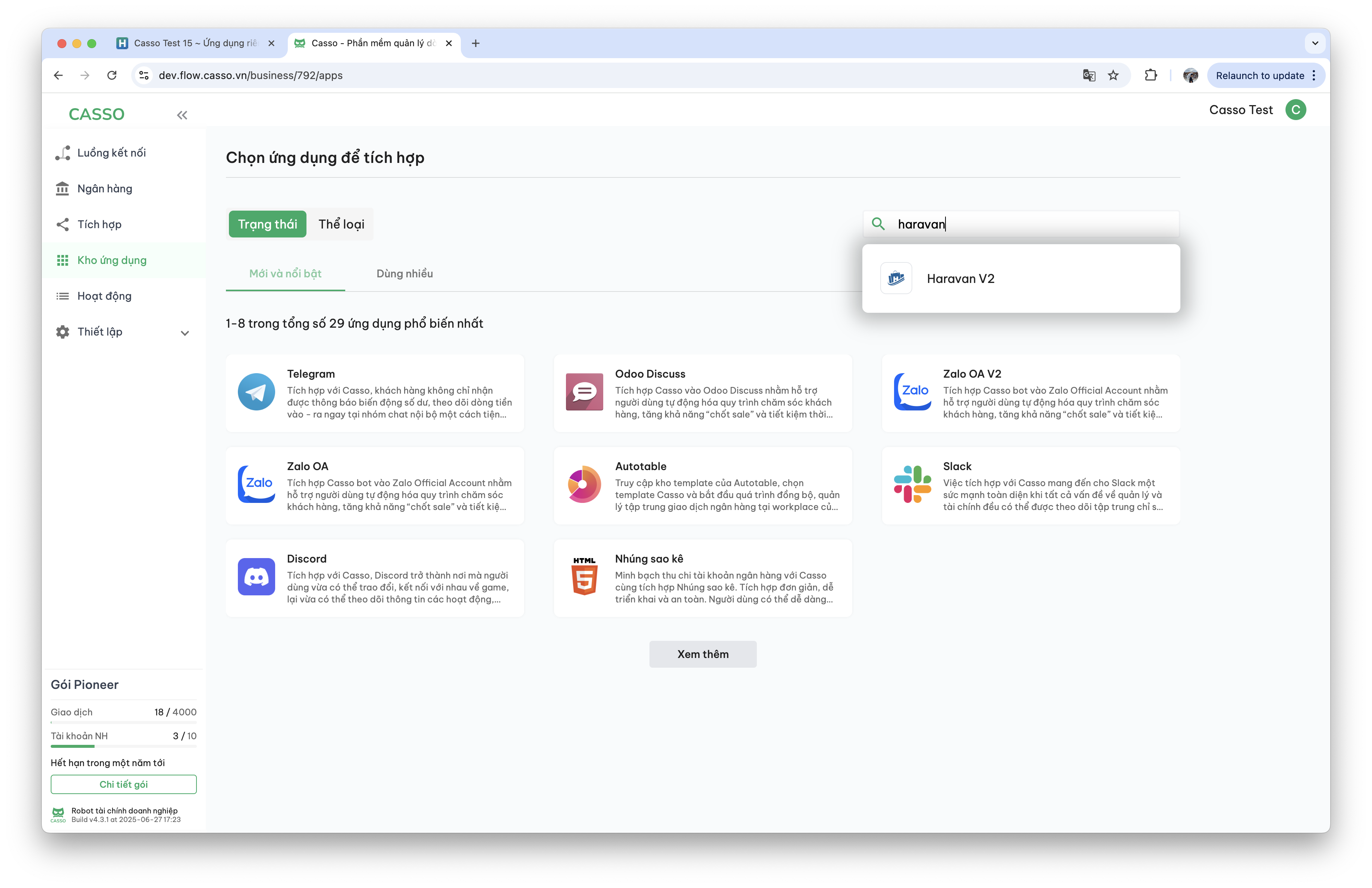 Truy cập vào Casso Flow => Kho ứng dụng => Chọn Ứng dụng Haravan V2 trên danh sách hiển thị hoặc trong kết quả tìm kiếm từ khóa haravan.