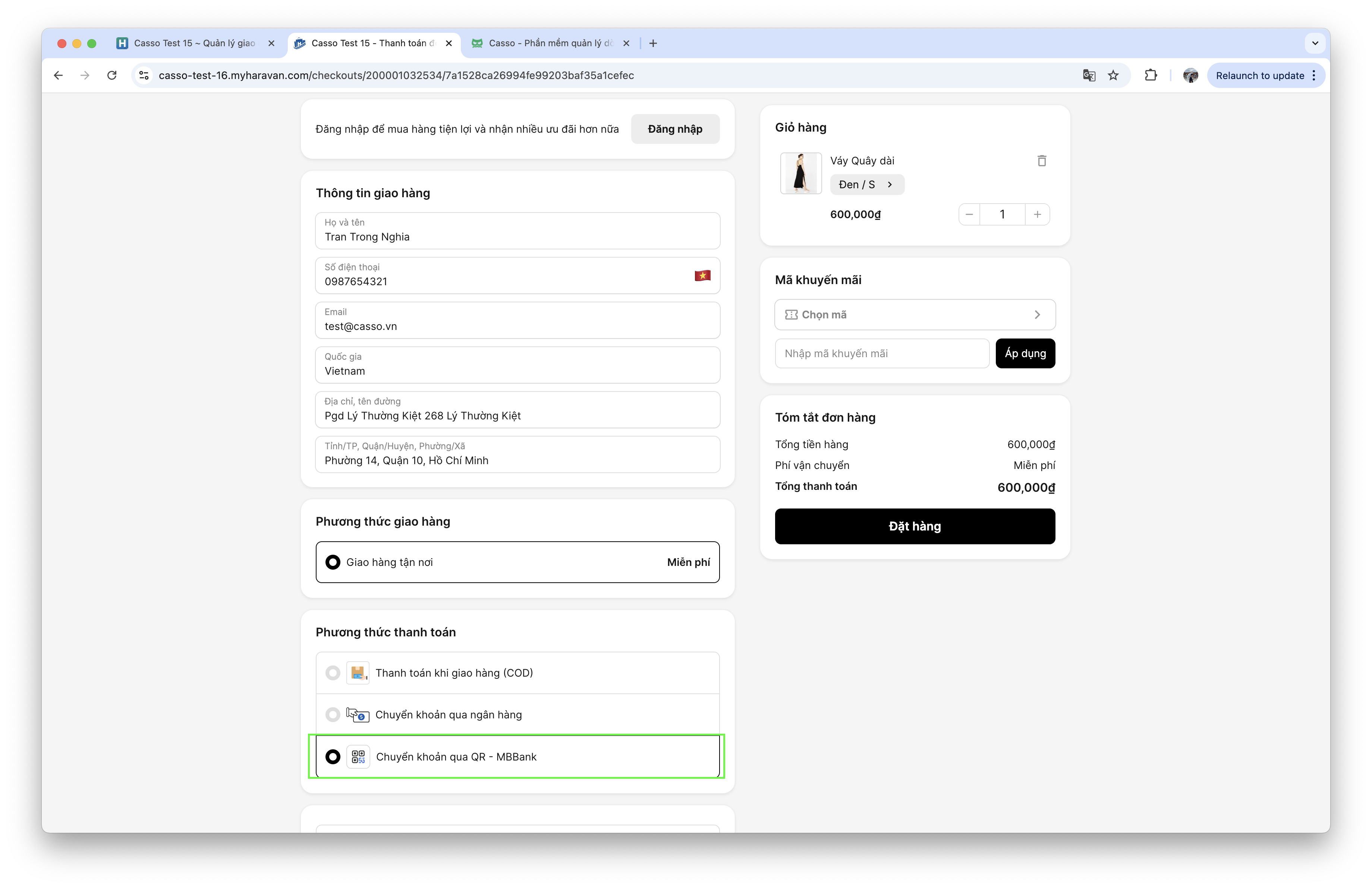 Ở trang Checkout, chọn phương thức thanh toán **Chuyển khoản qua QR - Tên ngân hàng**