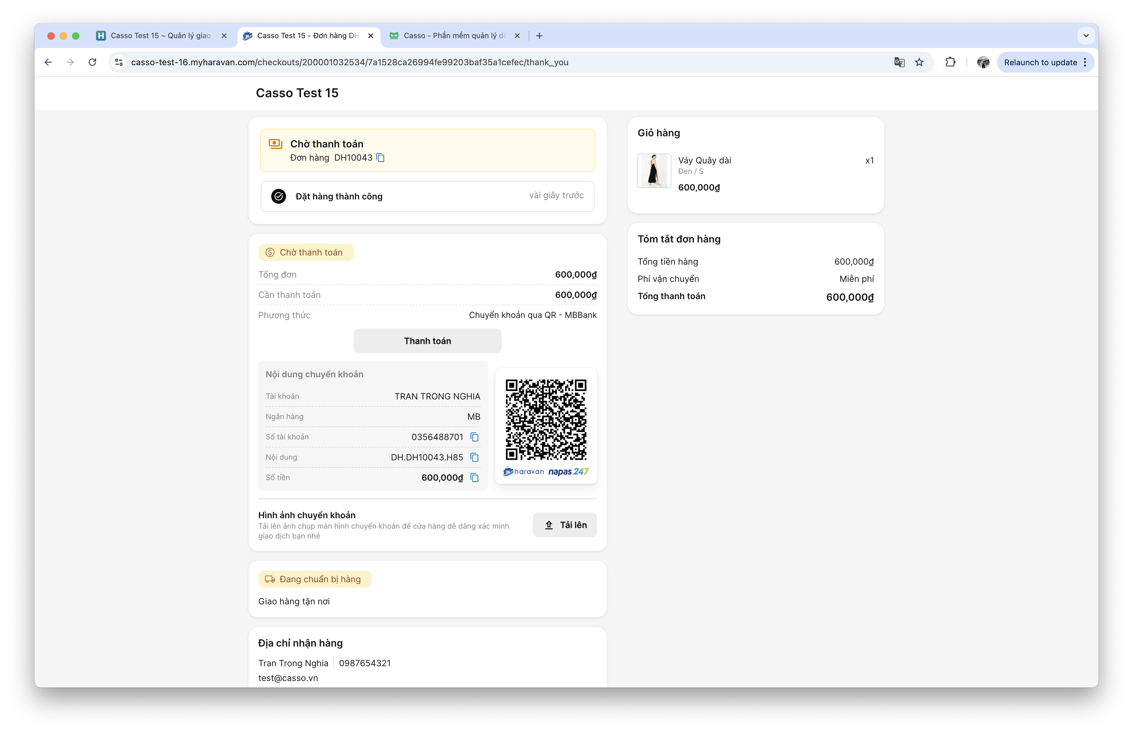 Sau khi đặt hàng thành công, quét mã QR để thanh toán chuyển khoản.