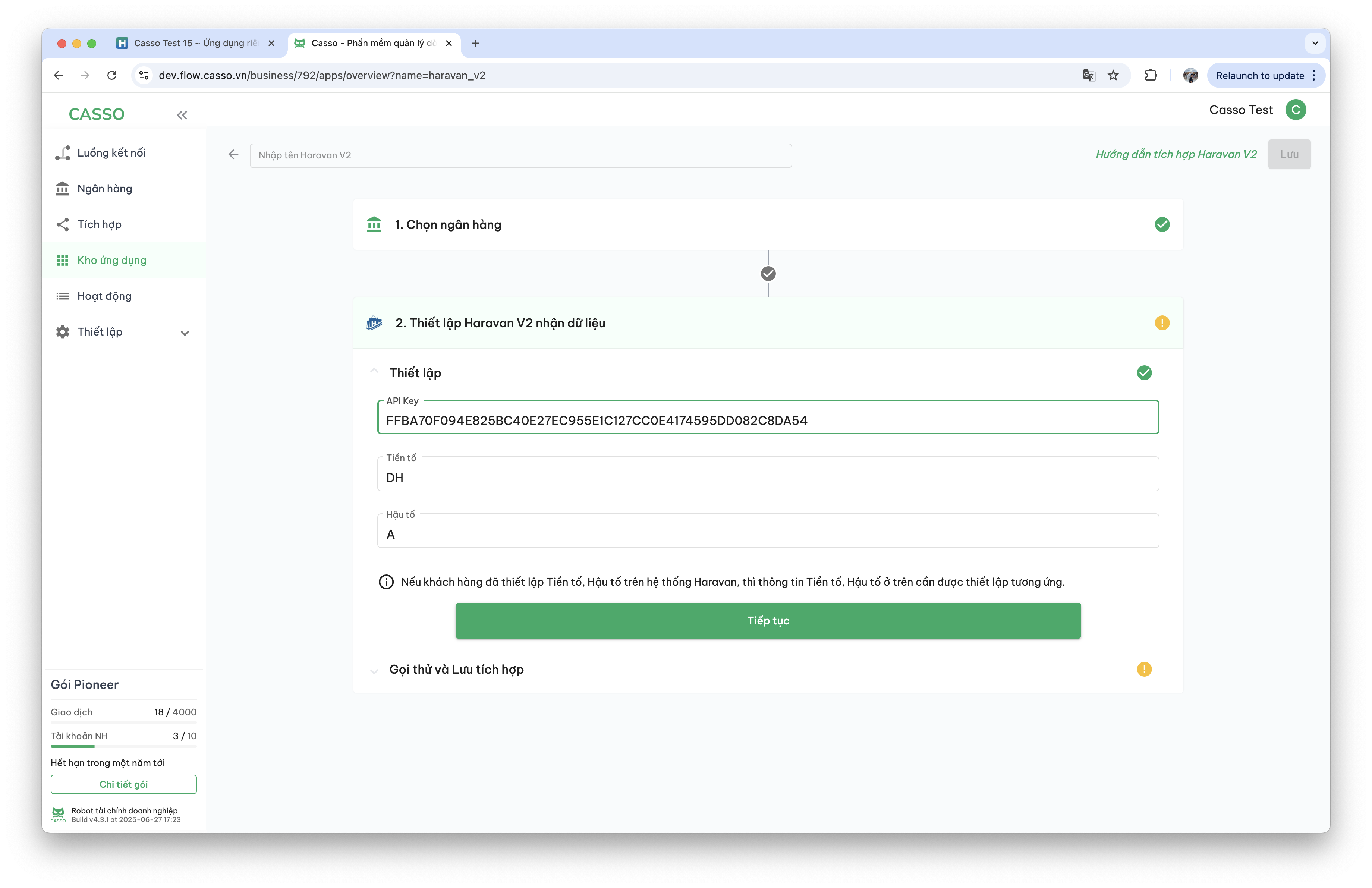 Nhập Token (tạo từ Haravan ở Bước 3) vào trường API Key trên cửa sổ tích hợp của Casso Flow => Thiết lập **Tiền tố, Hậu tố.**