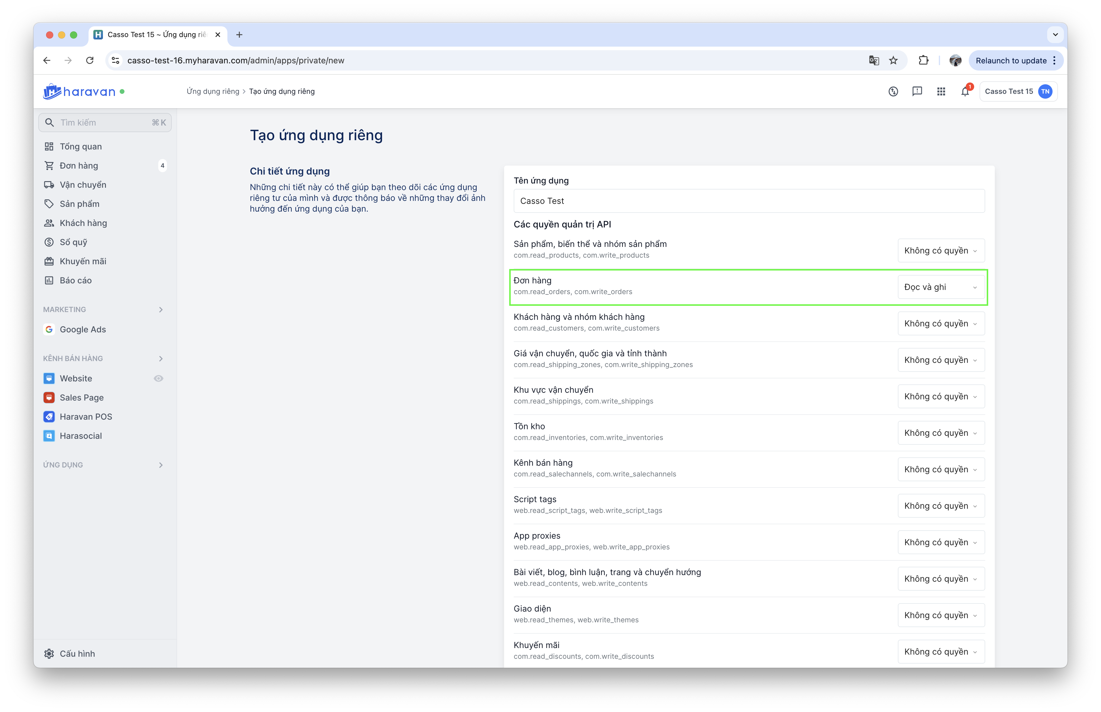 Chỉnh sửa lại cấu hình: cho phép đọc ghi ở đơn hàng => Lưu lại.